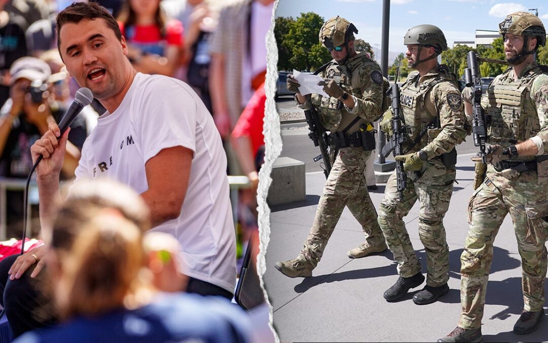 Charlie Kirk, left, is shown speaking at Utah Valley University on Wednesday, Sept. 10, 2025, prior to his assassination. On the right, police are seen responding to the shooting. (Trent Nelson/The Salt Lake Tribune/Getty Images; George Frey/Getty Images)