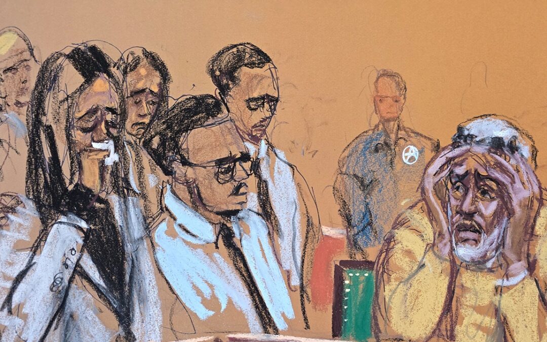 A sketch portrays Sean “Diddy” Comb and his defense team in federal court during his trial on June 18. (Jane Rosenberg)