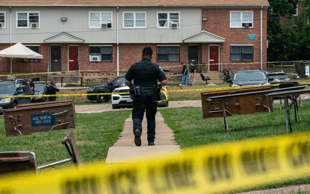 A Baltimore police officer attempts to secure a crime scene with tape at the scene of a shooting at the intersection of West North Avenue and Druid Hill Avenue in West Baltimore, Maryland. (REUTERS/Jim Bourg)
