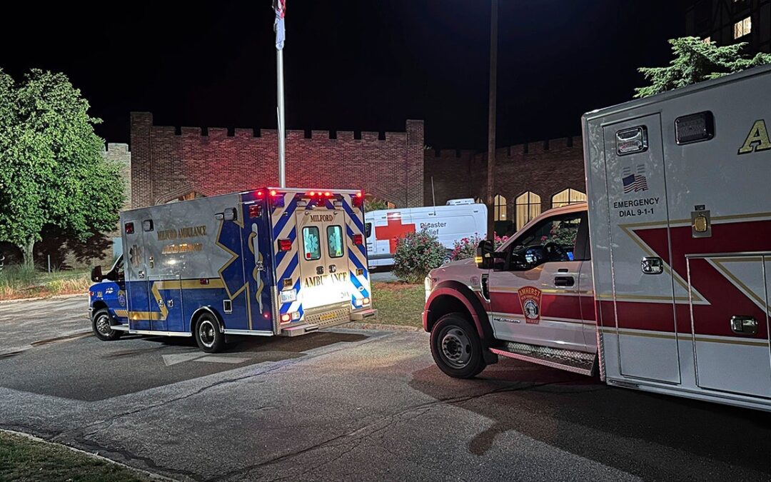 Ambulances are parked outside a hotel that is acting as a reunification center after a shooting at a country club in Nashua, New Hampshire, Saturday, Sept. 20, 2025. (AP Photo/Michael Casey)